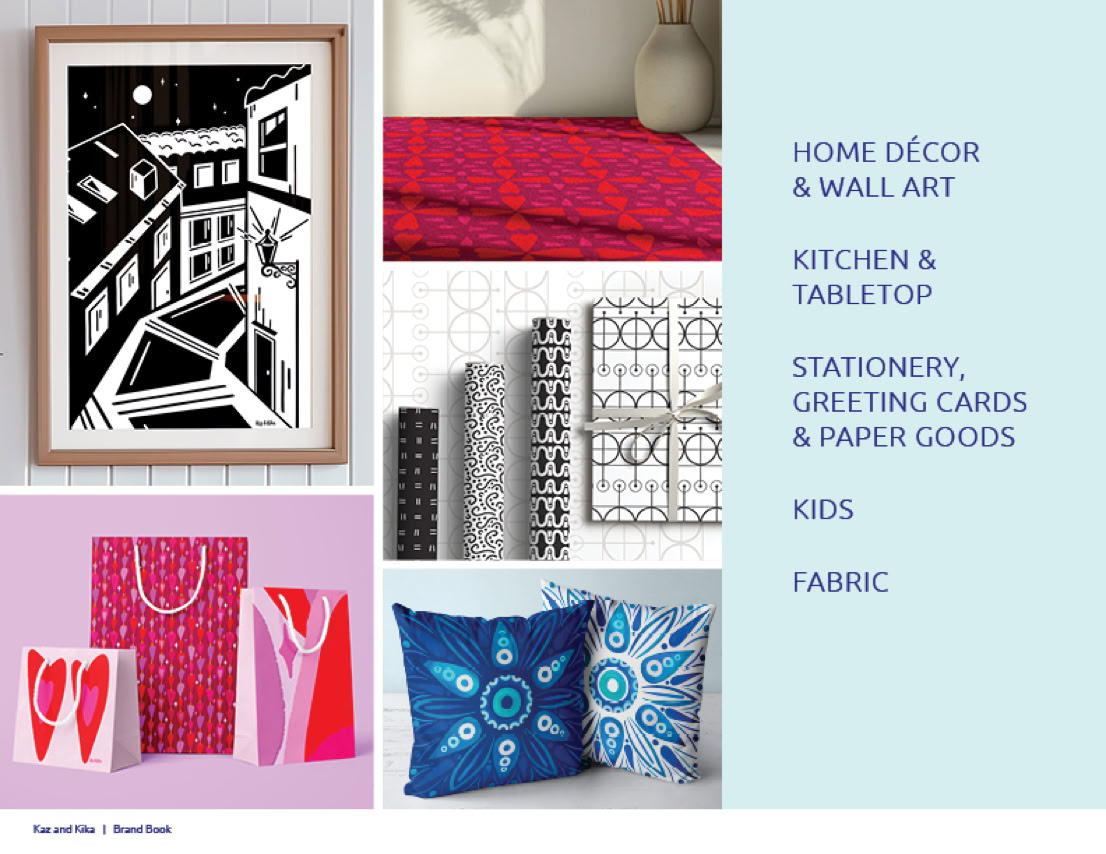 A visual overview of product categories, applications, and creative direction. Download the Kaz and Kika Brand Book.