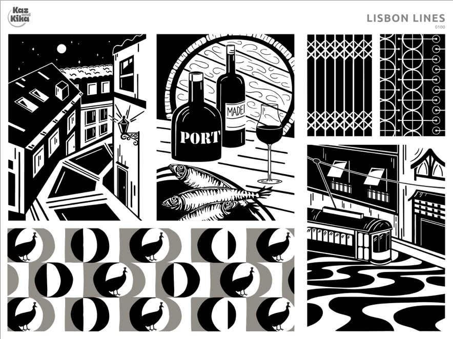 Inspired by a trip to Lisbon, Lisbon Lines captures the city’s graphic energy: calçada stone mosaics, moonlit architecture, bottles of port, and peacocks in garden shadows. Rendered in stark black-and-white style, with a nod to German Expressionist woodcut art. More >
