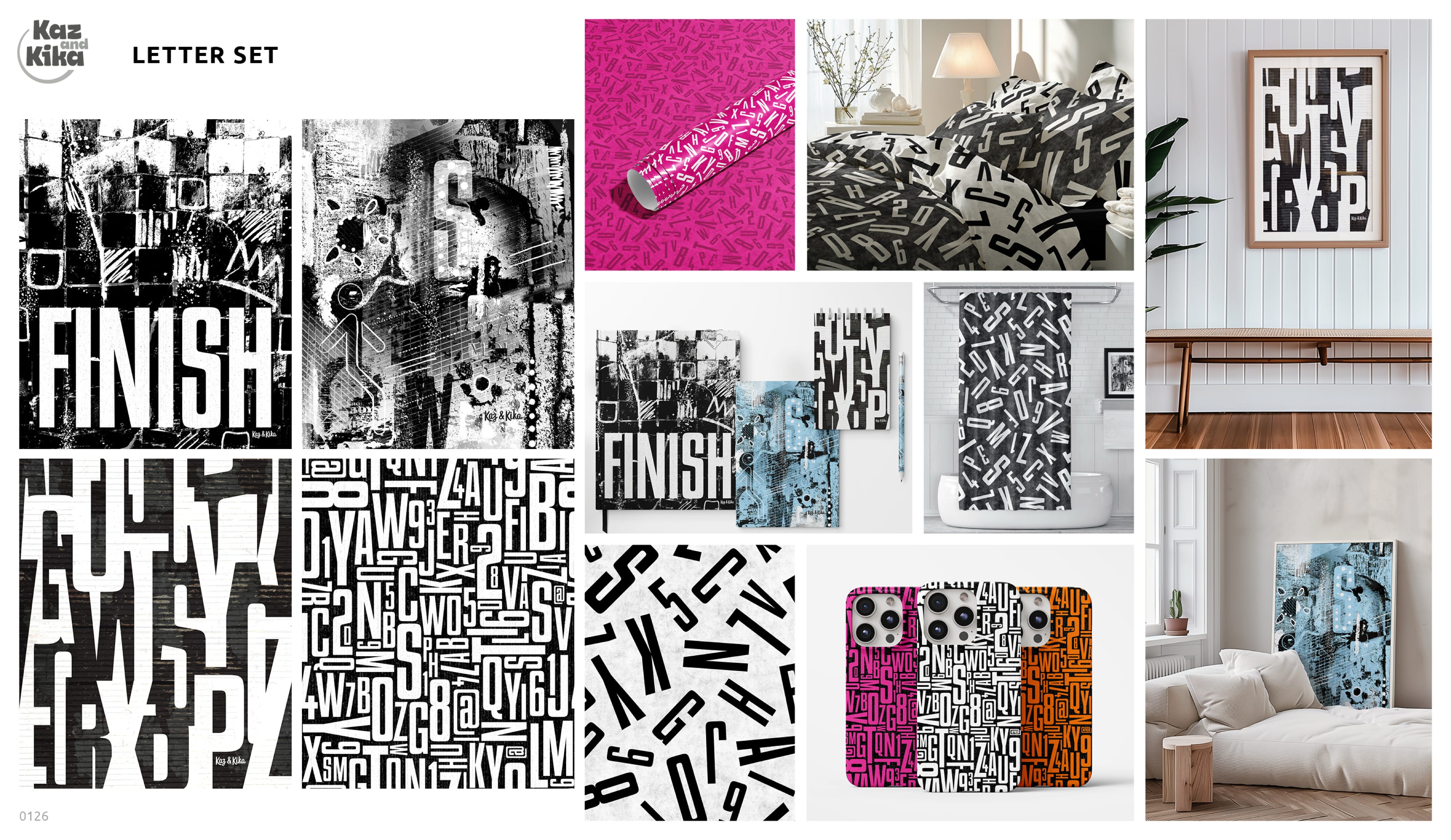 For me, Letter Set is a mix of past and present: the type design work I’ve been passionate about for decades, combined with my more recent focus on illustration and surface design. And I can see the collection on everything from prints and phone cases to fabric and home décor – proof that letterforms can live far beyond the page.