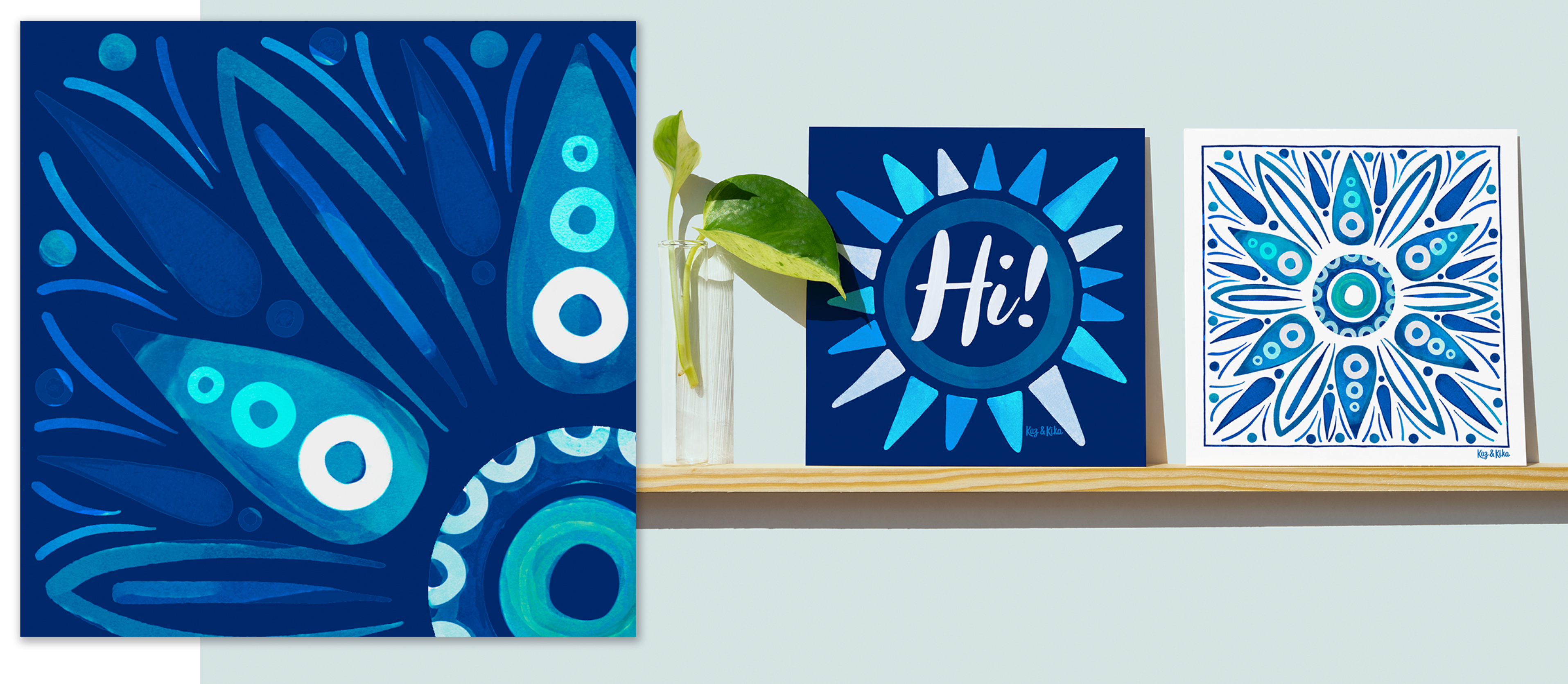 Right away, I thought of Mediterranean tiles. I’ve always loved the the blue and white Portuguese azulejos, so that was the direction from the beginning. I imagined these little sun motifs as tile designs, but with a more organic, hand-painted feel.