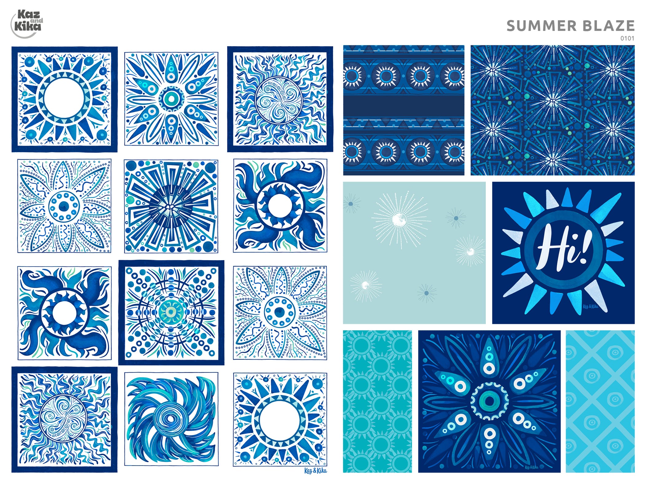 Summer Blaze is a collection of hand-painted sun tile patterns, inspired by traditional azulejos but reimagined with a playful twist. Think modern coastal tiles, sunny watercolor motifs, and bold blue and white designs perfect for fabric, wallpaper, and art prints.