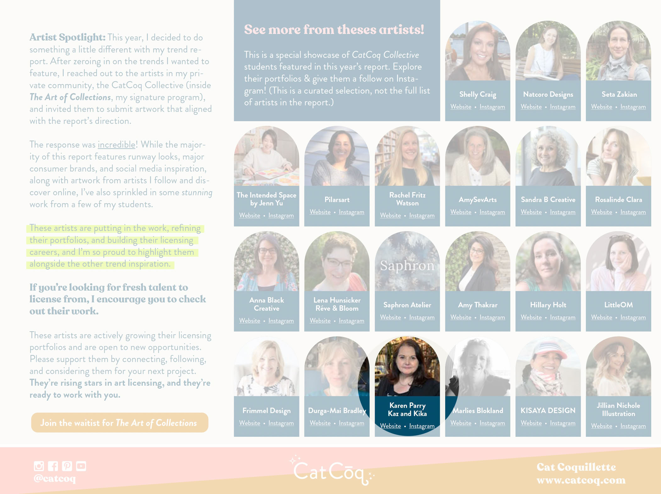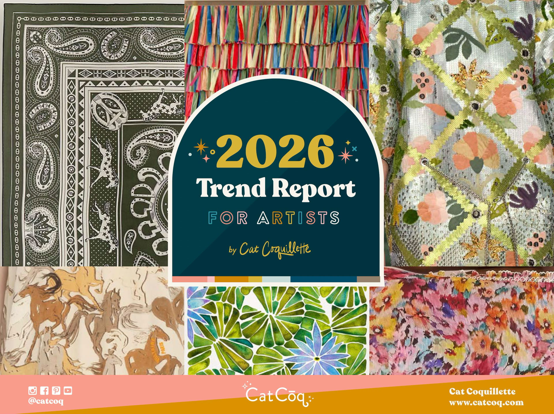 Cat’s Trend Report is known for its thoughtful, research-driven approach to forecasting visual trends specifically through the lens of art licensing and surface design. Each year, Cat combines runway references, consumer brands, and cultural signals with selected artwork from artists whose work aligns with emerging trends.