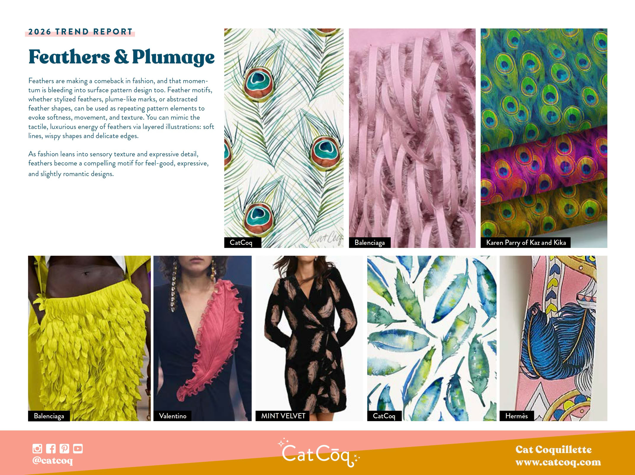My work appears in the Feathers & Plumage section, a trend centered on softness, movement, and expressive texture. Feather motifs – whether stylized, abstracted, or painterly – are re-emerging as a key visual direction, translating beautifully into surface pattern design across home, fashion, and stationery categories. Seeing Kaz and Kika artwork featured alongside major fashion houses and brands such as Balenciaga, Valentino, Hermès, and Mint Velvet was a blast.