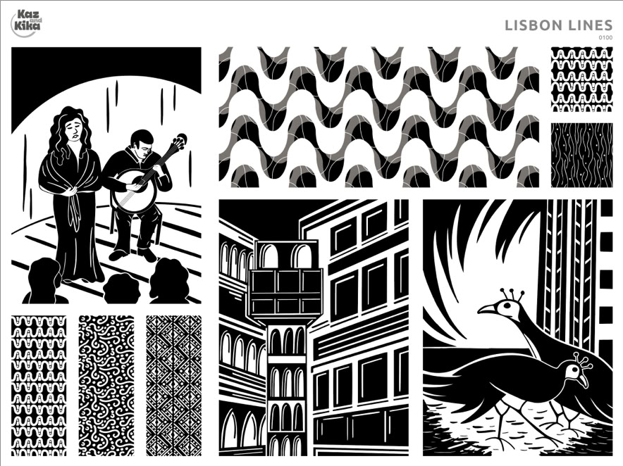 Inspired by a trip to Lisbon, Lisbon Lines captures the city’s graphic energy: calçada stone mosaics, moonlit architecture, bottles of port, and peacocks in garden shadows. Rendered in stark black-and-white style, with a nod to German Expressionist woodcut art. More >